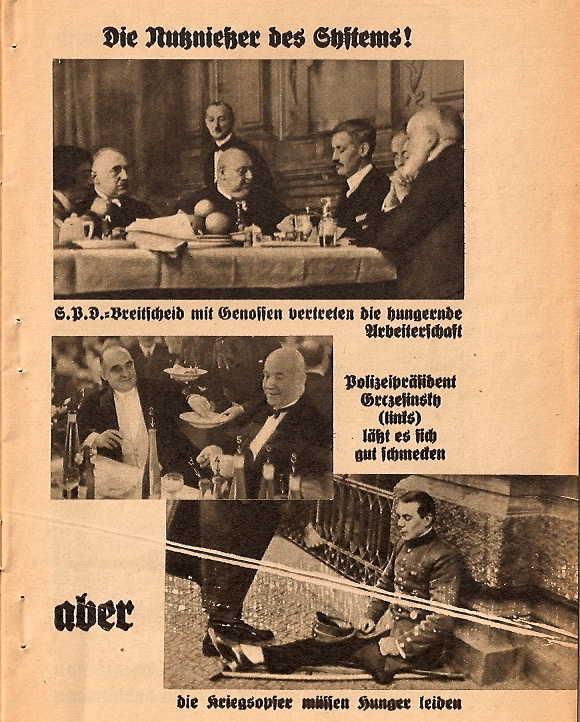 Na página 11 (Fig. 8), que descrevia os “beneficiários do sistema”, vemos duas fotografias de jantares luxuosos, nos quais aparecem políticos do SPD e o presidente da polícia, Grezesinsky. Logo abaixo delas, há um veterano de guerra, de muletas, a pedir esmolas numa calçada. A imagem vem acompanhada dos dizeres: “Breitscheid, do SPD, com companheiros. Eles representam trabalhadores famintos. O presidente da polícia Grezesinsky (à esquerda), aprecia uma boa refeição. Mas veteranos de guerra têm de passar fome.”