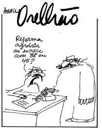 Na imagem (fig. 1), Henfil apresenta os conflitos de interesses do campesinato e das autoridades – ou dos representantes delas – reforçado pela linguagem verbal: “Reforma agrária se escreve com 38 ou 45?” O humor reside em torno do núcleo verbal e na maneira como o primeiro indivíduo segura a arma, fazendo alusão a um lápis. O segundo, por sua vez, não manifesta reação, permanecendo a dúvida em torno da indagação do primeiro. A resposta está subentendida, pois refere-se à violência, ou seja, a reforma agrária não ocorrerá pois representa ameaça contra os interesses de uma classe dominante: a latifundiária. Embora não seja evidente, esta constatação está implícita ou não-dita, uma vez que a reforma agrária implica na concessão de direitos à posse de terra para os camponeses, porém o Estado burguês não irá conceder tal acesso, uma vez que a prestação de serviços aos latifundiários e empresários capitalistas ainda é lucrativa (MARX & ENGELS, 1982)8.