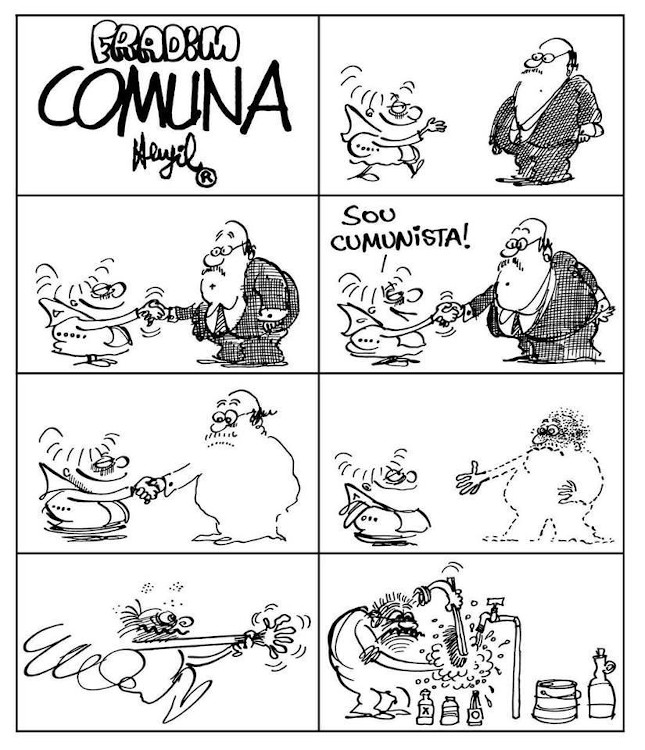 Na tira, percebemos que um dos fradins – Baixinho, o alter ego de Henfil – dirige-se para cumprimentar outro sujeito. No terceiro quadro, ele se apresenta como comunista, mantendo o aperto de mãos. Na sequência, o outro sujeito começa a desaparecer após o cumprimento e corre para lavar as mãos no penúltimo e no último quadro. Após esta descrição, podemos elaborar algumas proposições: