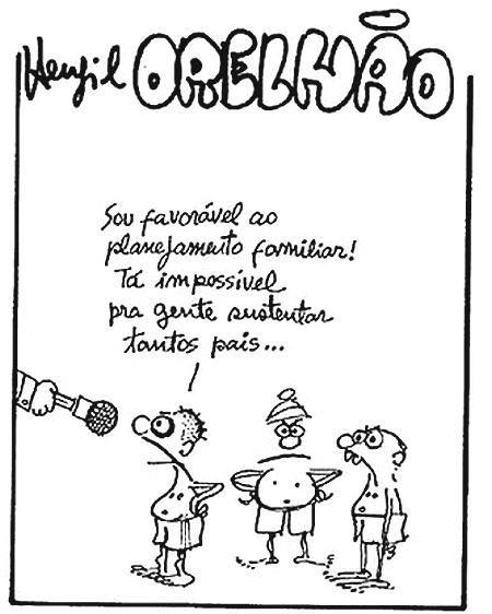 A próxima análise (fig. 3) trata-se de um grupo de três crianças indignadas, as quais concedem entrevista a um repórter (Orelhão). A indignação das crianças é denotada pela expressão facial e corporal – sobrancelhas franzidas, bocas cerradas e mãos apoiadas na cintura, seguida do relato da criança ao microfone do repórter. Ao afirmar que é favorável ao planejamento familiar, a criança demonstra que não é ingênua e surpreende no término do relato com um final inesperado, constituindo o sentido de humor no enunciado “Tá impossível pra gente sustentar tantos pais...”. No encerramento da afirmação deduzimos que o cartum se refere a um acontecimento real, relacionado à mendicância infantil, mas não necessariamente a um tempo-espaço utilizando figuras de conhecimento público e pode ser interpretado em diferentes épocas, pois trata-se de uma realidade social presente no cotidiano dos cidadãos das grandes cidades. O cartum nos remete ao conceito de Gramsci relacionado ao fetiche do Estado – aquele que é paternalista e proporciona direitos, mas também ao Estado autocrata (FERNANDES, 1987) – aquele que possui privilégios para a acomodação de interesses burgueses e superexploração da força de trabalho. Em ambas as definições percebemos a miséria gerada pela desigualdade social como instrumento de manutenção do domínio estabelecido sobre as classes dominadas, numa espécie de ciclo. Podemos recorrer também a Engels (1982) quanto às formas de dominação burguesas que inviabilizam o desenvolvimento da classe proletária.