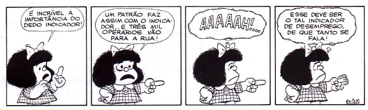 Este processo de conscientização das massas pode ser compreendido através da interpretação da Mafalda ao associar o dedo indicador da mão com o indicador de desemprego. A imagem é dividida em quatro quadros: