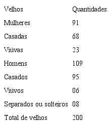 De acordo com o quadro, dos 200 velhos que vivem nos lotes da Colônia Conceição, há ligeira desproporção entre homens e mulheres. O que chama a atenção nesses dados é a quantidade de mulheres viúvas, a qual é bem superior ao número de homens. Isso ocorre, em parte, porque os homens que ficaram viúvos ao longo do tempo refizeram suas vidas com outras companheiras. Os viúvos se casam com mais frequência que as viúvas, como apontam Fernandes e Garcia (2010, p. 778):