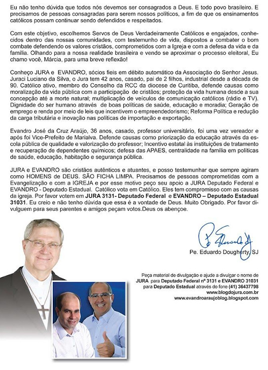 De todo modo, no patamar religioso, os materiais encontrados mostram que ambos tiveram suas campanhas endossadas por figuras renomadas do catolicismo carismático, como é o caso de Pe. Eduardo Dougherty, um dos fundadores da vertente brasileira da RCC. Em texto assinado pelo sacerdote, como mostra a Imagem 2, Jura e Evandro Araújo foram colocados como homens de Deus, aptos a defender os valores e interesses da Igreja Católica na sociedade, estando a recomendação de voto também acompanhada da afirmação que católico vota em católico. O candidato Jura foi também apoiado por Pe. Reginaldo Manzotti, que, tal qual exposto na Imagem 3, não apenas recomenda o candidato aos eleitores, como incentiva que esses divulguem sua candidatura. Deste modo, esses sacerdotes, enquanto nomes influentes dentro da RCC, podem ter contribuído para que a estreia oficial do MFP/PR no âmbito dos processos eleitorais tenha recebido maior aprovação entre os fiéis.