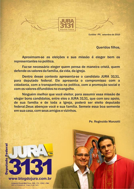 ALMEIDA, Antonio Marco de. Padre Reginaldo Manzotti apóia Jura. 2010. Disponível em: http://marquinhotb.blogspot.com/2010/09/padre-reginaldo-manzotti-apoia-jura.html?m=0. Acesso em: 1 jun. 2021.
