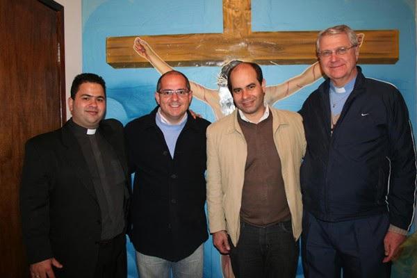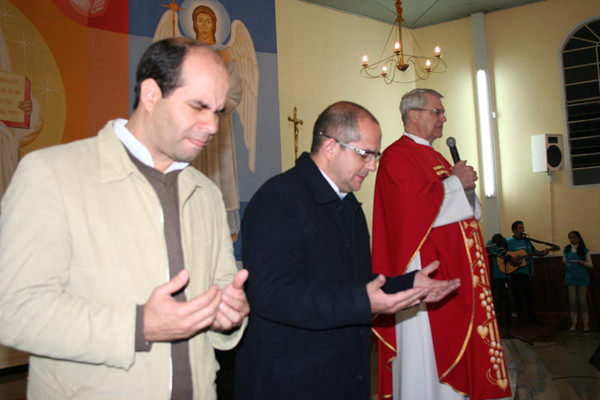 Ademais, os dois candidatos foram fotografados lado a lado em espaços religiosos durante a campanha, o que pode ter contribuído para reforçar suas imagens enquanto membros participantes da Igreja Católica e da RCC. Em 17 de agosto de 2010, Jura compartilhou foto (Imagem 4) em que aparecia, junto a Evandro Araújo, na companhia do padre, apresentador de TV e rádio Cleberson Evangelista, e Pe. Eduardo Dougherty. Em outra imagem publicada pelo candidato Jura, os dois representantes da RCC/PR nas urnas são vistos em oração ao lado de Pe. Eduardo Dougherty, no altar de missa presidida pelo sacerdote (Imagem 5).