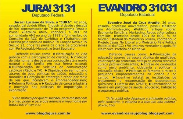 Nesse sentido, refletindo acerca de um posicionamento de candidatos da RCC, de certa forma, alinhado a pautas progressistas, é válido apontar que há uma espécie de contraste entre algumas delas. Embora não tenhamos identificado materiais de Gessani, são flagrantes as diferenças entre as bandeiras políticas defendidas por Jura e Evandro Araújo, a despeito de produzirem juntamente materiais e receberem os mesmos apoios em suas campanhas. Como exemplo das pautas defendidas por Evandro Araújo e Jura, temos o flyer a seguir (Imagem 8) que traz, lado a lado, informações sobre os dois candidatos, contando com seus dados de urna e endereço de suas páginas na internet, breves biografias que valorizam tanto suas trajetórias profissionais quanto religiosas, as principais causas por eles defendidas, e uma citação de teor religioso.