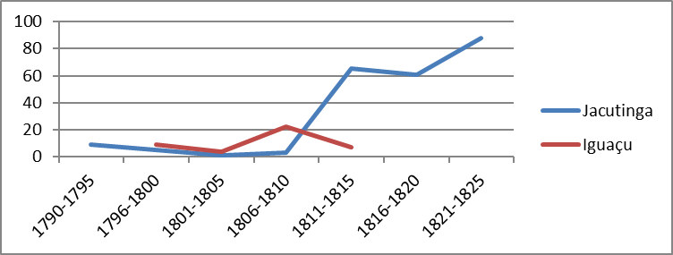 Dividi o período em quinquênios. Antes de prosseguirmos, porém, devo ressalvar que para Iguaçu, até onde sei, não há livro que cubra todo o lapso temporal. Deste modo, fica difícil mensurar a real presença de africanos a partir de 1813, tendo em vista que a partir deste ano houve incremento de escravos adultos para Jacutinga, quiçá também tenha havido para Iguaçu, mas não encontramos fontes seriais, especialmente livros de batismo, que afirmem tais deduções. Para amenizar a ausência de livro de batismo referente ao período em questão, buscamos os testamentos junto ao livro de óbito de Piedade de Iguaçu. E, por mais que não se comparem aos batismos, através deles foi possível atestar, também em Iguaçu, a presença africana depois de 1813.