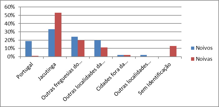 Chama atenção também, em Jacutinga, o percentual de 33,3% de noivos e 53% de noivas nascidos na localidade. Isto é, fregueses que, no mínimo, faziam parte da segunda geração familiar vivendo no mesmo local. Se acrescermos a eles os habitantes de outras freguesias vizinhas, como Iguaçu, Pilar e Marapicu, estes números tendem a aumentar. Em Iguaçu, diferente de Jacutinga, apenas 14% dos noivos foram inscritos como “natural desta freguesia”, mas as noivas da mesma localidade representam 28% das casadas. Por mais que demograficamente os percentuais de Iguaçu não possam ser menosprezados, estão aquém dos números de Jacutinga. Iguaçu também apresenta alto percentual de noivos, 53%, mas o pároco não anotou a naturalidade. Pode ser que muitos deles fossem habitantes antigos da freguesia, como Francisco Barbosa de Sá Leite e Antônio Lopes Pimenta, ambos moradores antigos de Piedade de Iguaçu, que não tiveram suas origens e/ou procedência assinalados, ou mesmo forasteiros, que os padres não sabiam de onde vinham (ACDNI-LCPI, 1787-1829).