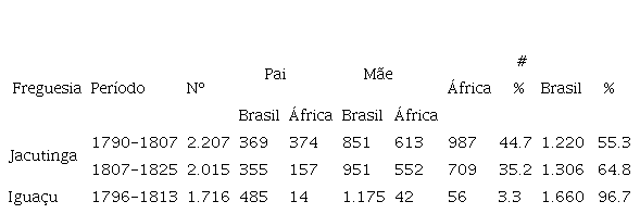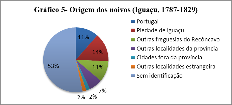 É possível perceber também que ambas as freguesias eram receptivas e/ou ofereciam atrativos àqueles que vinham de fora, já que em Jacutinga, por exemplo, 20,6% dos noivos eram originários de fora do Recôncavo da Guanabara, como Saquarema, Cabo Frio ou mesmo freguesias da Corte. Por outro lado, por mais que Iguaçu apresente apenas 7% de noivos de freguesias fora do Recôncavo da Guanabara, tais números parecem suspeitos, já que para 56% dos noivos e 52% das noivas não há identificação do local de origem.