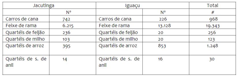 Percebe-se que havia dois engenhos e 70 escravos em Iguaçu, e sete com 236 escravos em Jacutinga, isso entre 1779 e 1789. Quando cruzamos o número de escravos registrados nas memórias públicas endereçadas ao vice-rei Luiz de Vasconcelos, 2.138 em Jacutinga e 1.219 em Iguaçu, conforme quadro 1, com a população escrava das duas freguesias no quadro em tela, nota-se que os escravos que trabalhavam nos engenhos de açúcar correspondiam apenas a 11,2% do total em Jacutinga e 5,7% em Iguaçu. Neste caso, além de perguntarmos onde se ocupava a população escrava de Jacutinga e Iguaçu, cabe outra indagação: onde estava empenhado o restante dos escravos? Certamente, parte considerável na produção de alimentos.