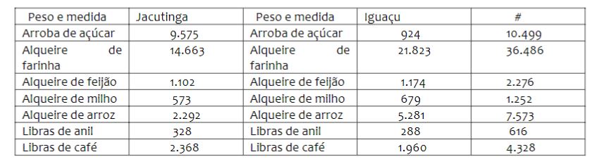 Em Jacutinga, na relação entre produção e exportação, percentualmente, as maiores exportações eram de anil (99,1%), açúcar (93,5%), café (75%), arroz (58,9%) e farinha (38,4%). Seguindo a mesma lógica, em Iguaçu era açúcar (100%), café (100%), anil (100%),6 arroz (78,9%) e farinha (64,2%). Milho e feijão, portanto, ao que se nota, eram cultivados muito mais para o consumo do que para a exportação. Cabe ressaltar, contudo, que os percentuais não podem ser apreendidos como prova sine qua non de exportações, já que esta poderia ser efetuada entre as próprias freguesias do recôncavo ou vendida localmente. Como exemplo cito o feijão, posto que as duas freguesias produziram 2.276 alqueires e exportaram apenas 96. É pouco crível que mais de dois mil alqueires de feijão fossem para consumo próprio. Aliás, em Jacutinga tinha um porto chamado “do feijão”, o que reforça nosso argumento.