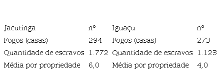 Há que se frisar, ademais, como já havia salientado João Fragoso para todo o Rio de Janeiro (FRAGOSO, 2010), nas duas localidades a posse escrava era difundida por todo o tecido social; posto que 78% dos fogos de Iguaçu e 64% de Jacutinga possuíam escravos (AHU-LNHG, 1797). Ou seja, os habitantes estavam totalmente envolvidos com o tráfico de escravos ou com a reprodução endógena de seus escravos.