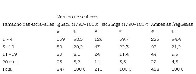 Em números absolutos, de um período ao outro, a população de Iguaçu cresceu 91 %, enquanto a de Jacutinga cresceu 4,5%. Isoladamente, a população escrava de Iguaçu cresceu 84,8% e a de Jacutinga 13,5%. No último quartel do século XVIII, por exemplo, nunca menos de 48% da população das cercanias da baía da Guanabara era formada por escravos. É importante destacar que nestes altos percentuais a posse de escravos não era concentrada, já que predominavam pequenas e médias escravarias. Isto é possível perceber através da lista nominativa de habitantes das duas freguesias do ano de 1797. Provavelmente ela não dê conta da totalidade dos cativos, posto que muitos senhores ocultavam a quantidade real de escravos que possuíam por questões fiscais, como salientara Monsenhor Pizarro. Mesmo assim, acredito que as médias de cativos dela extraídas revelem a estrutura de posse das duas freguesias. Vejamos: