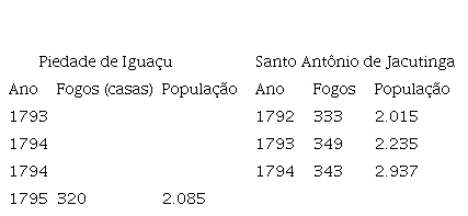Na lista de 1797, Jacutinga consta ter 294 fogos e Iguaçu 273. Teriam decrescido demograficamente, após dois anos da passagem do religioso por aquelas paragens? Talvez, como nos alertou o próprio Pizarro, tais números não condizem com a realidade das duas freguesias, que por algum motivo que nos foge no momento – quem sabe pelo que o padre sugeriu –, a lista não contemple toda a população. Como estas listas eram feitas para fins fiscais e militares, é possível que parcela considerável da população fosse ocultada pelos senhores. Por exemplo, Manoel Inácio de Faria, morador do Babi, Jacutinga, na lista de 1797 consta ter 24 escravos, entre adultos e menores; mas quando cruzada a lista com os cativos levados ao batismo pelo mesmo senhor, entre 1790 e 1807, ele aparece como proprietário de 41 escravos batizados. Seja como for, constata-se que o crescimento da população, tanto livre como escrava, fora considerável entre a virada do século XVIII e a década de 1820 do século XIX. Como veremos a seguir, no caso da população escrava, parcela considerável era de procedência africana.