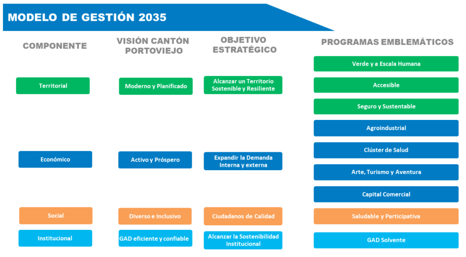 En dicho instrumento se determina los ejes priorizados de desarrollo, alineados a la visión, que esta administración, tiene para el cantón Portoviejo, misma que señala que: Para el año 2035, a500 años de fundación, Portoviejo es reconocido como un territorio inteligente, incluyente, próspero y sostenible. Modelo de cantón para la vida y el encuentro Manabita, que ofrece un hábitat digno y servicios públicos de calidad a ciudadanos orgullosos de su identidad cultural. Centro de negocios donde se aprovechan los recursos naturales de manera sustentable y la capacidad de su población, para la agroindustria de exportación, el turismo, los servicios especializados de alto valor agregado como la salud e industrias creativas, impulsado por un Gobierno autónomo, moderno, eficiente y confiable, que lidera la articulación regional, junto a una sociedad civil organizada, activa y con valores recuperados. (Plan de Desarrollo de Portoviejo, 2015)