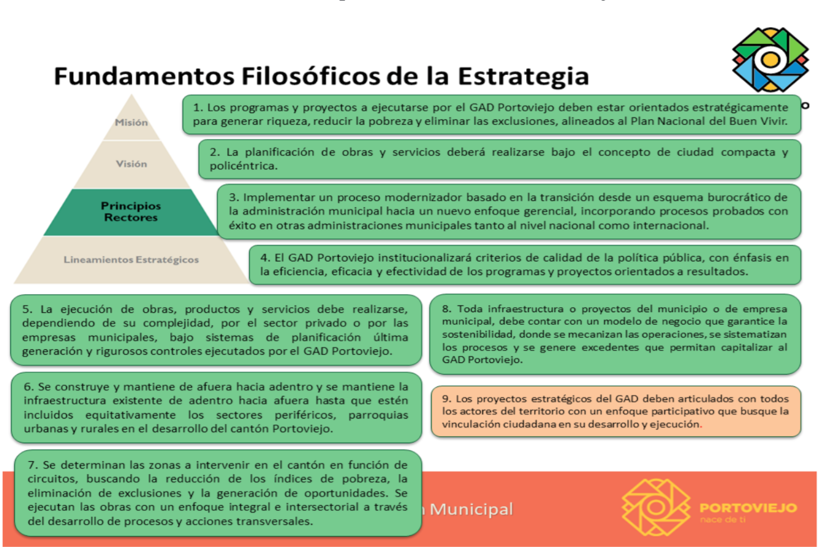 La planificación estratégica y organización territorial del GAD Portoviejo se describe en el plan de desarrollo y ordenamiento territorial con programas estratégicos y ejes de desarrollo territorializados a través de una normativa de ordenamiento que diseña la visión cantonal en una línea de tiempo y gestiona el desarrollo y crecimiento del cantón en centralidades. (Plan Maestro Urbano Portoviejo: 2019).