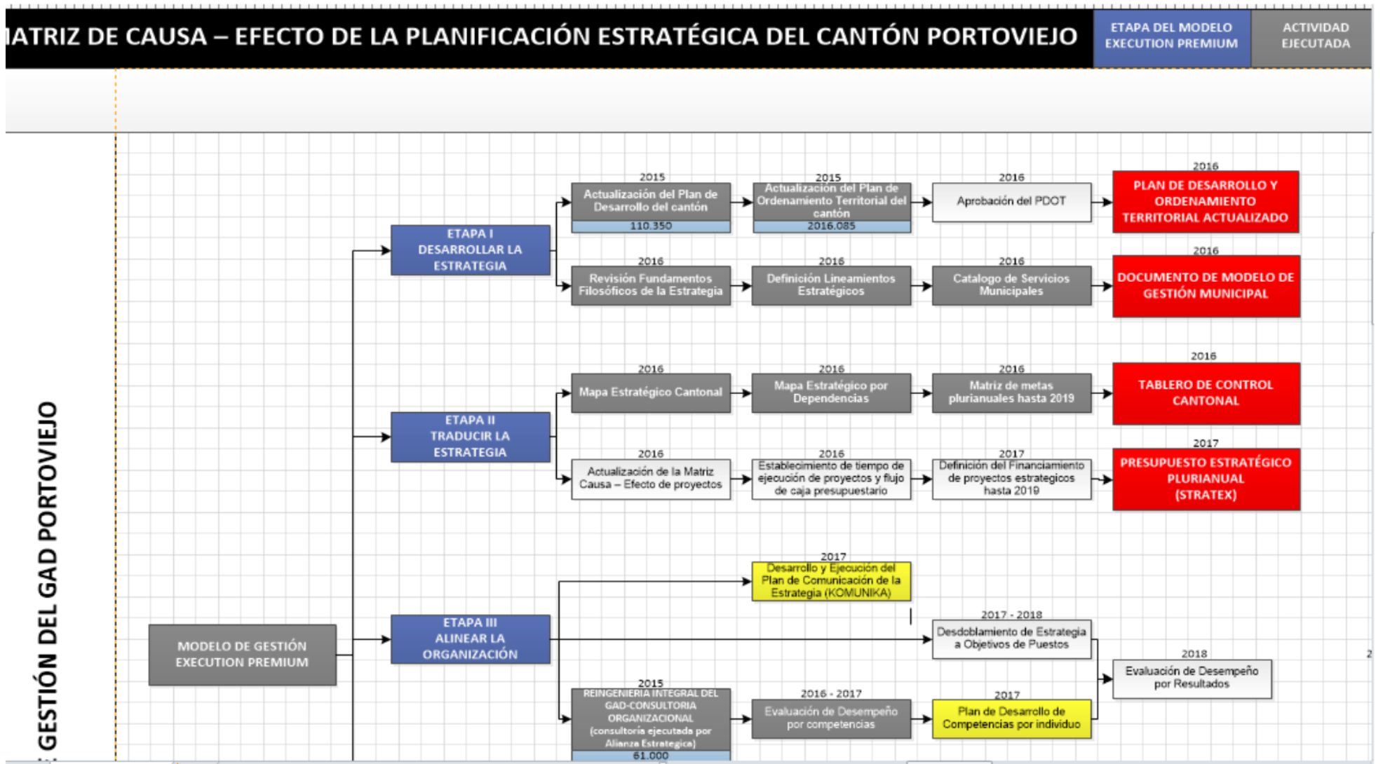 En esta misma etapa se desplegaron las iniciativas estratégicas que se detallan en el plan de desarrollo de Portoviejo, y para una mejor comprensión y establecimiento de prioridades de una manera articulada entre todas las organizaciones lo que se resume en un instrumento denominado matriz causa efecto. Gráfico. 3