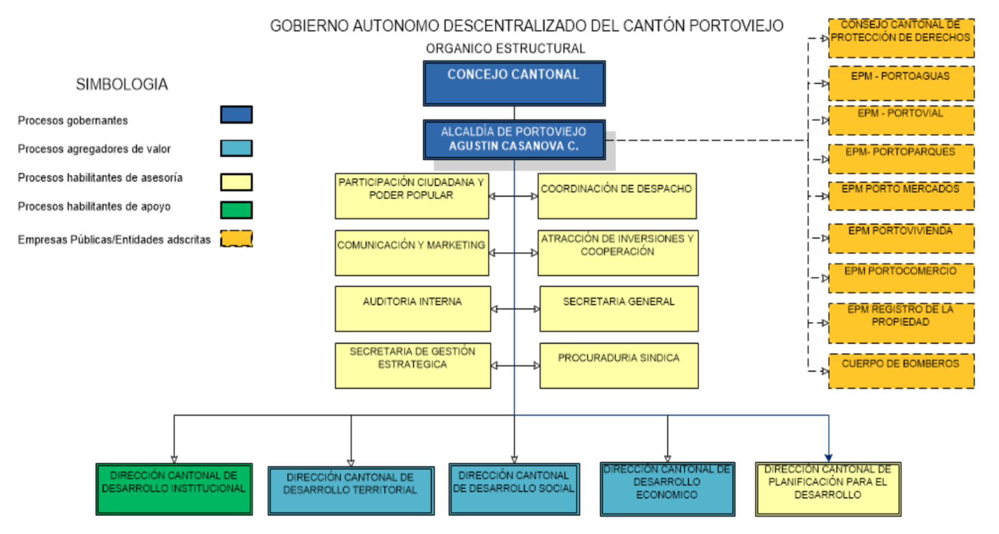 Dicho modelo de gestión y el plan de desarrollo supera lo que señala la Ley respecto de las competencias de los gobiernos descentralizados de la escala territorial cantonal, a saber: “Elaborar y ejecutar el plan cantonal de desarrollo, el de ordenamiento territorial y las políticas públicas en el ámbito de sus competencias y en su circunscripción territorial, de manera coordinada con la planificación nacional, regional, provincial y parroquia; y, realizar en forma permanente, el seguimiento y rendición de cuentas sobre el cumplimiento de las metas establecidas” y: “Decidir el modelo de gestión administrativa mediante el cual deben ejecutarse el plan cantonal de desarrollo y el de ordenamiento territorial, los planes de urbanismo y las correspondientes obras públicas.(CÓDIGO ORGÁNICO DE ORDENAMIENTO TERRITORIAL AUTONOMÍA Y DESCENTRALIZACIÓN, 2010) en el sentido de que el plan y modelo no solo se enfoca en lo que corresponde a las obras de la competencias señaladas en la ley citada sino que abarca un amplio rango de acciones que permiten al municipio de Portoviejo asumir roles importantes incluso temas productivos que son competencia del consejo provincial, así lo podemos ver en el plan de desarrollo aprobado por el consejo municipal (Plan de Desarrollo y Ordenamiento Territorial, 2017).