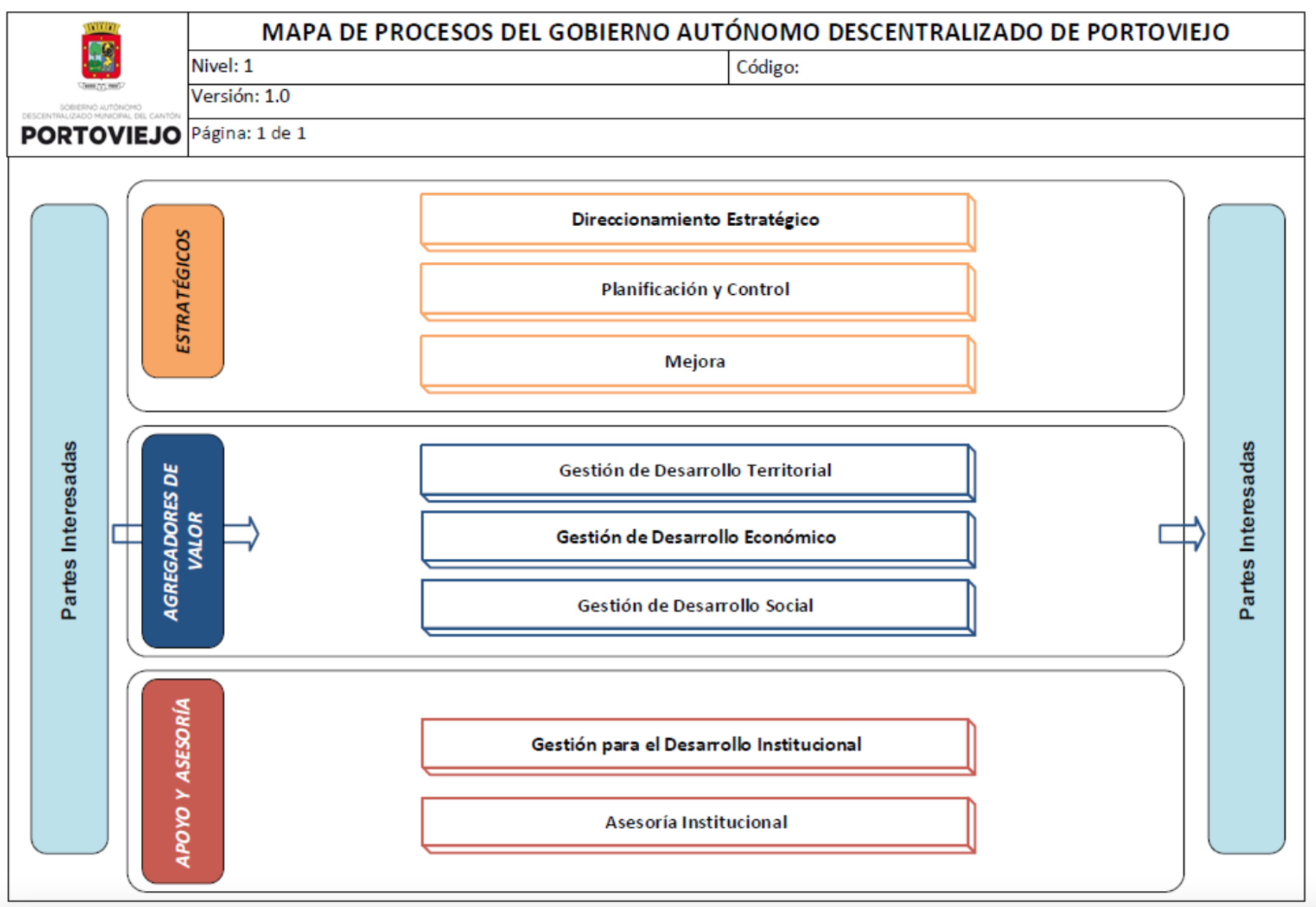 • Aspectos estratégicos: Planes de desarrollo y ordenamiento territorial PDOT 2014 –2019 con metas al año 2025, expresadas a su vez en el mapa estratégico municipal de Portoviejo 2017 – 2019 el cual traduce en políticas, perspectivas y objetivos las directrices contenidas en dicho plan de alto nivel.