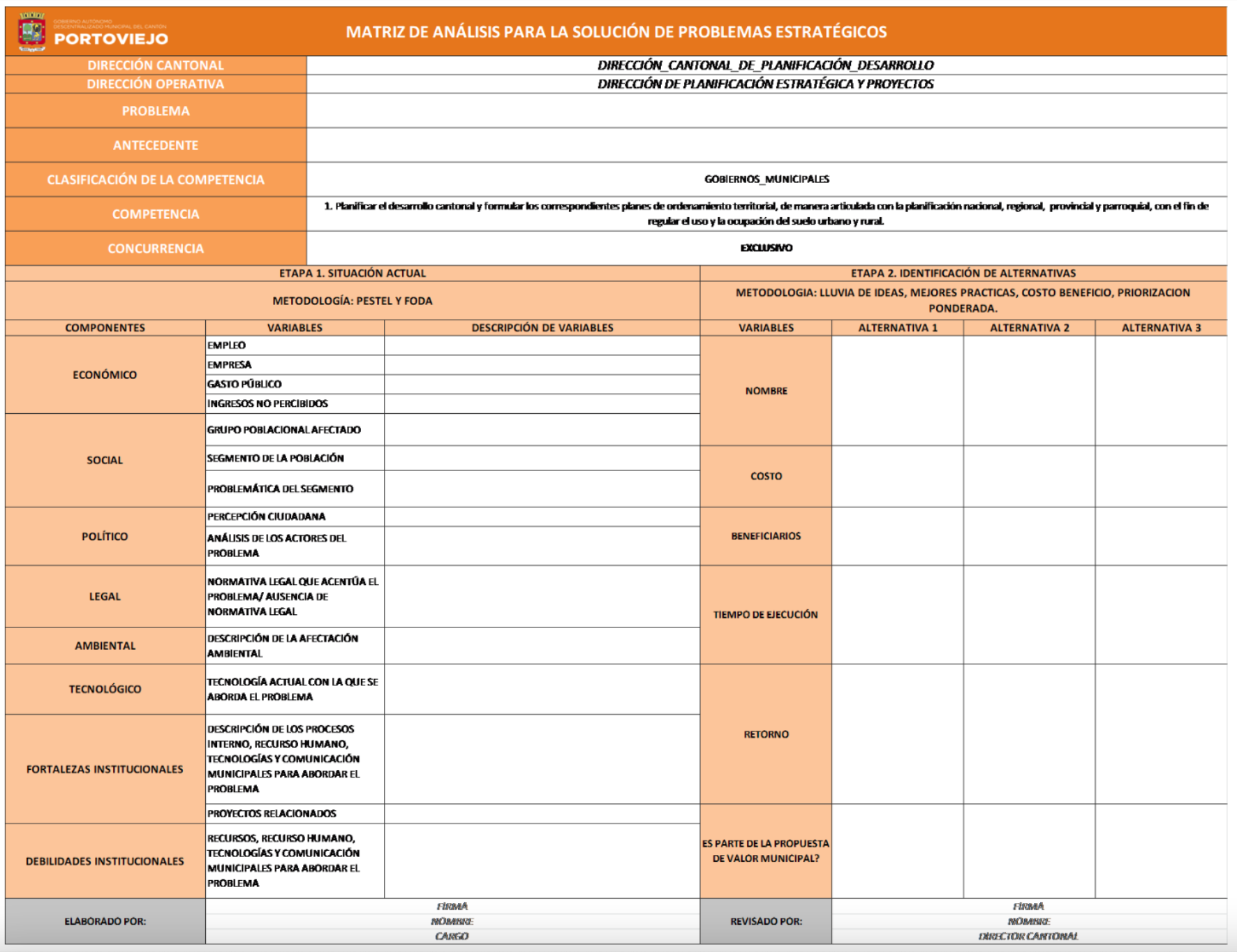 En los que respecta a la pregunta dos, se debe realizar un análisis estratégico y en el GAD de Portoviejo se han utilizado herramientas de diagnóstico territorial las cuales se implementaron durante la elaboración del plan de desarrollo, pero adicionalmente en el despliegue se utilizan instrumentos como el FODA y PESTEL para la elaboración y propuesta de proyectos operativos y estratégicos, el primero se detalla dentro del manual del modelo de gestión del GAD y el análisis PESTEL en el instrumento de análisis y solución de problemas (GAD Portoviejo, 2017)