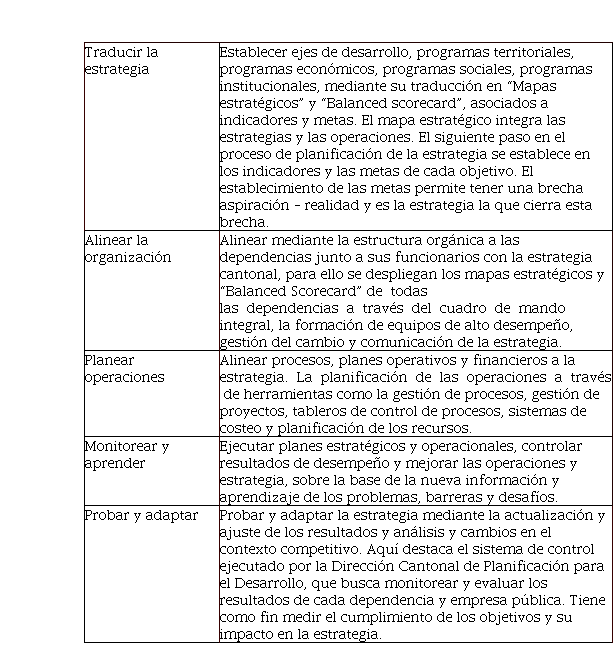 En este sentido, el Execution Premium es un modelo de gestión que presenta de manera integral el ciclo complete de gestión desde la estrategia hasta la ejecución operativa, y reúne prácticas en cada una de las etapas del modelo, y se señala que han sido aplicadas en organizaciones con y sin fines de lucro. (Kaplan y Norton, 2016) teniendo en cuenta el contexto de elaboración del modelo que es de origen norteamericano; sin embargo, en Portoviejo se lo implementó teniendo resultados como los indicados e implementando productos en cada una de las etapas.