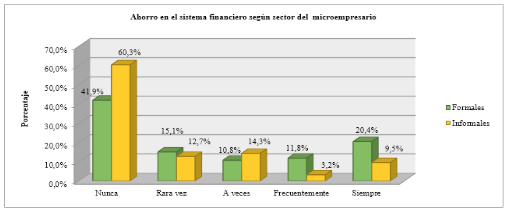 En base a la investigación realizada y de acuerdo con los resultados que se detallan en la figura 2, se determina que el 41,9% de los microempresarios formales no canalizan sus ahorros en el sistema financiero ecuatoriano, mientras que con una cifra superior el sector informal no lo realiza en un 60,3%. De igual manera solo el 9,5% de los referidos informales siempre utilizan las entidades financieras para este fin, mientras que por el sector formal lo realizan con un 20,4%. Estos porcentajes denotan que los microempresarios informales utilizan los productos financieros en menor escala a comparación de los formales.