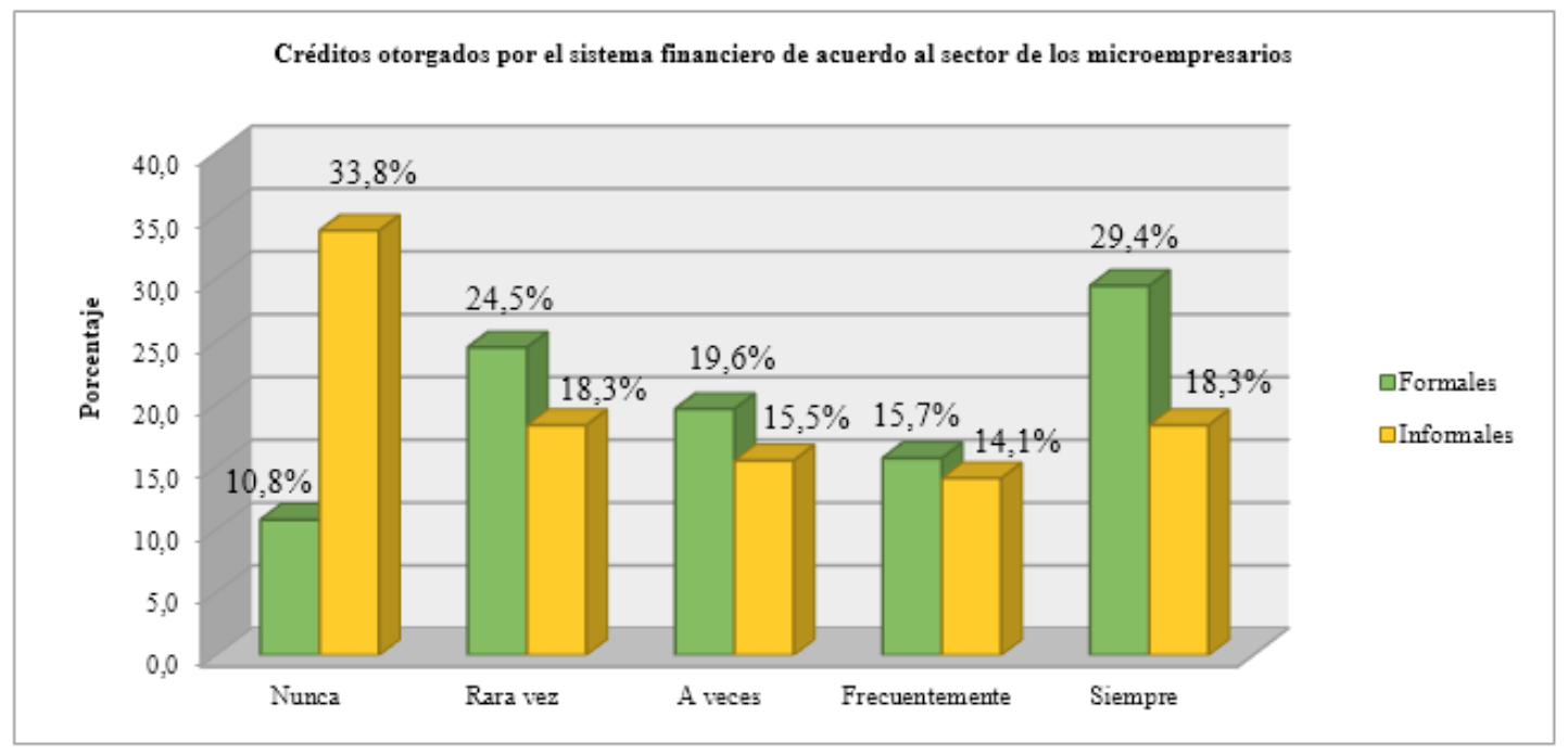 Al realizar un análisis comparativo en relación al acceso al microcrédito según el sector de los microempresarios como se presenta en la figura 3, se determina que únicamente el 10,8% de los encuestados que pertenecen al sector formal no han accedido al financiamiento otorgado por una entidad financiera, mientras que para los microempresarios del sector informal este porcentaje se incrementa considerablemente al 33,8%. Lo cual refleja el grado de dificultad que presenta este sector para cumplir con los requisitos que establecen las entidades financieras para ser calificado como sujeto óptimo en el otorgamiento de un crédito, por lo que deben buscar otras fuentes de financiamiento. De igual forma el 29.4% de los microempresarios formales manifiesta que siempre obtienen fondos del sistema financiero, a diferencia del 18,3% para los informales.