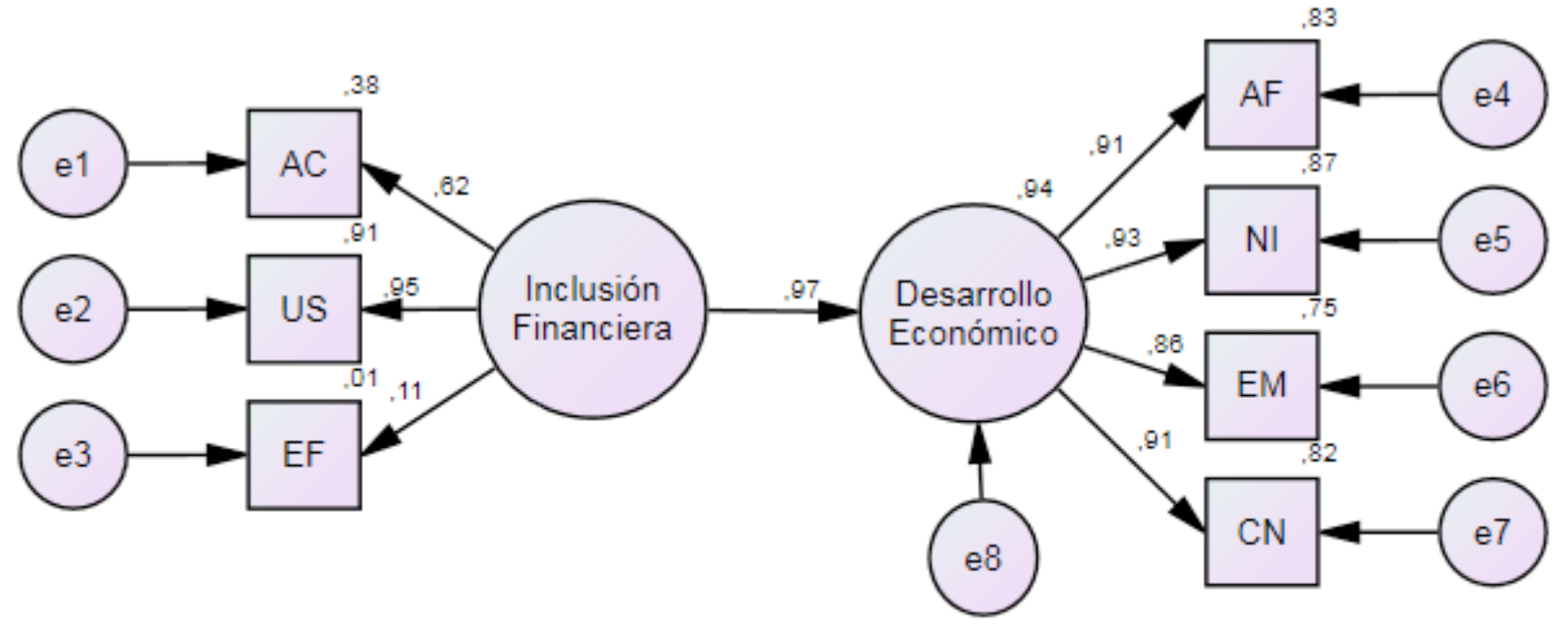 Posteriormente, se realizó un análisis multivariante, a través del Modelo de Ecuaciones Estructurales. En la figura 5 se presentan los resultados, entre los cuales se establece que existe correlación positiva y significativa entre las variables Inclusión financiera y desarrollo económico, por cuanto su indicador es de 0,97 que supera el nivel de 0,40 establecido por Hair, Anderson, Tatham, & William (1995).