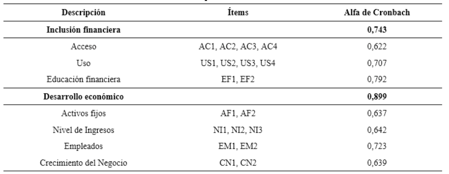 Como se observa el coeficiente Alpha de Cronbach para las variables inclusión financiera y desarrollo económico son de 0,743 y 0,899 respectivamente. Los datos evidencian el carácter reflectivo de los ítems por cuanto la fiabilidad de las escalas de medida establecidas por el indicador Alpha de Cronbach supera el valor aceptable de 0,70 establecido por Luque (1997).