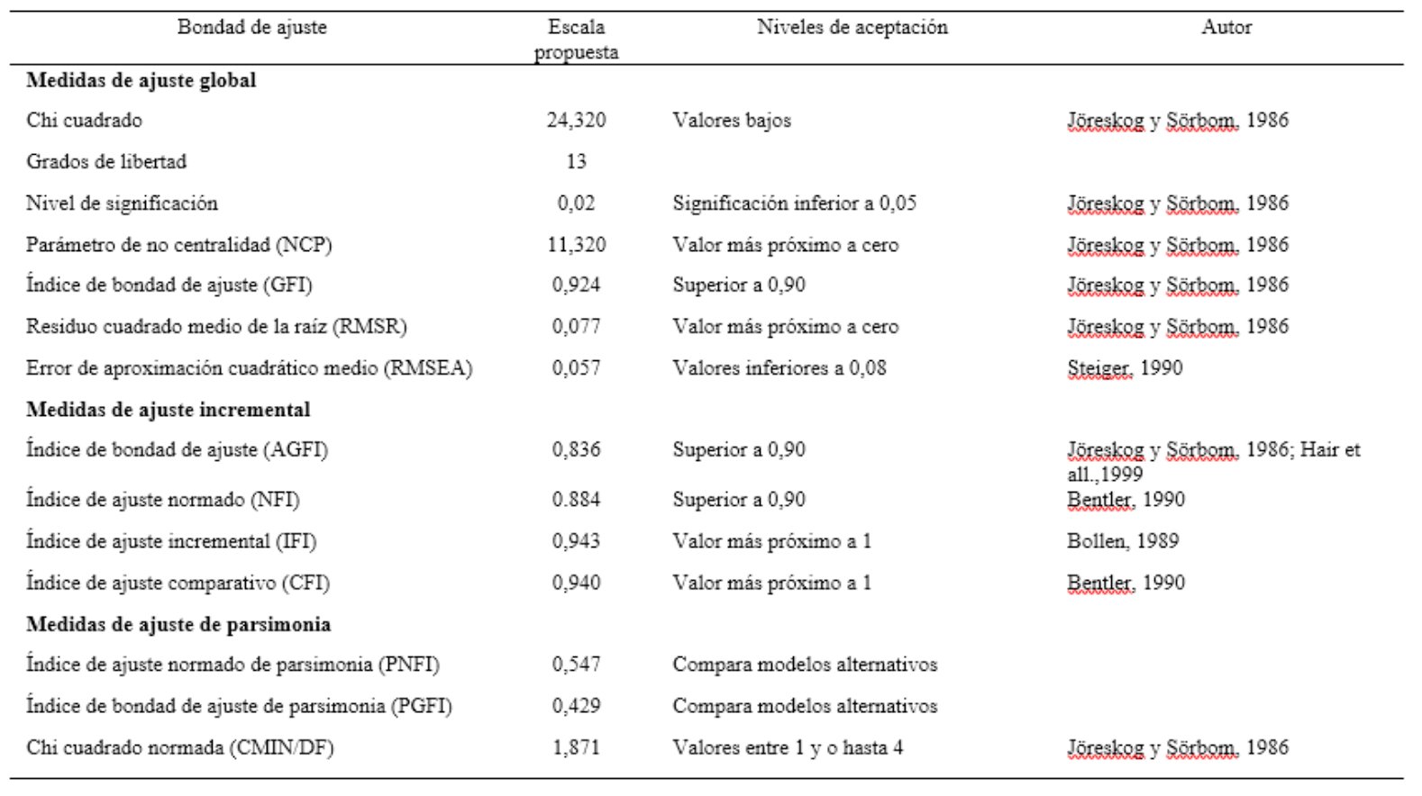 Tabla 2. Bondad de ajuste del modelo propuesto