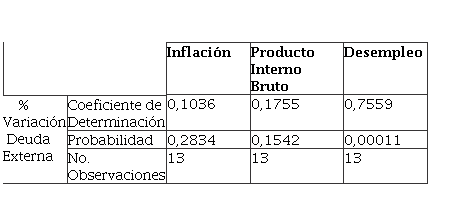 La tabla 1, se observa las variables analizadas, la única que presenta una alta y fuerte relación con un bajo nivel de significancia es la variación en la tasa de desempleo. La alta y fuerte relación se observa en el coeficiente de Determinación de 0,7559, cuyo nivel de significación es P = 0,00011, confirmando que el argumento es válido. En el caso de las otras variables inflación y tasa anual de variación PIB, la relación es débil e inversa. Es decir que el desempleo influye en los altos niveles de endeudamiento para el caso mexicano en el período escogido de estudio por la influencia en el resto del mundo.