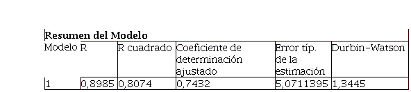 La aplicación del modelo de regresión múltiple con el análisis ANOVA, demostraron que la variable dependiente con las independientes, son factibles para el modelo, es decir una relación general aceptable; sin embargo se añadió el estadístico Durbin-Watson para corroborar los resultados con una aceptación en los porcentajes arrojados. Estos procesos de cálculo facilitaron el estudio del modelo por los grados de compatibilidad y en el análisis histórico de los indicadores.