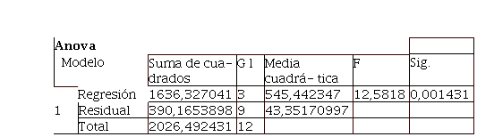 De acuerdo a la regresión, en el análisis de la varianza (ANOVA) el estadístico F indica que es significativa. El nivel de significación obtenido es P = 0,001431, esto permite asegurar con precisión los resultados, que las variables si son significativas para el modelo. Tabla 3.