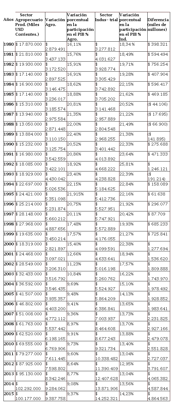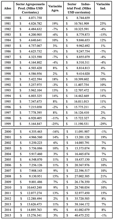 Tabla 1. Evolución del Sector Agropecuario e Industrial 1980 -2015