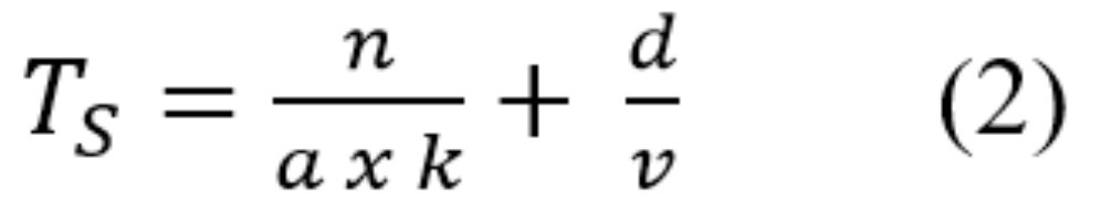 Finalmente para calcular el tiempo de evacuación se aplica la fórmula propuesta por K. Togawa que permite determinar el tiempo de respuesta ante una situación de emergencia. Donde en número (n) de personas a evacuar se toma de 100, ancho (a) de salida de 3.64 metros, la distancias (d) total en metros desde los patios de aclimatación hasta la salida 180 metros, constante experimental de flujo (k) 1.3 personas /m*segundo y la velocidad experimental de desplazamiento 0.6 m/s