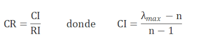 Para comprobar que los juicios de valor enunciados son consistentes, Saaty (1994) propone un ratio de consistencia (CR) cuya expresión es: