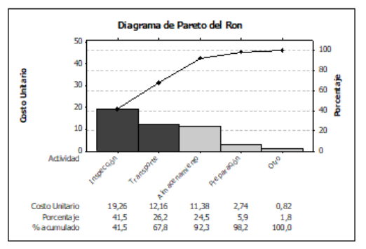 Al analizar los diagramas de Pareto de cada una de las producciones, se observa que las actividades en las cuales la entidad debe prestar mayor atención son: en el caso del ron las inspecciones y los transportes, ya que presentan un porciento acumulado de 67,8%. Para el vino, las actividades de inspección, almacenamiento y preparación con el 79,3% y en el refresco la preparación y el almacenamiento con 82,1% acumulado de los costos totales. Siendo común en los casos del ron y el vino las actividades de inspección y en el refresco la preparación, dependiendo estas de la calidad de la materia prima tal como argumentan García y Sanfiel (2001), Albores y Álvarez (2015), Farjas
