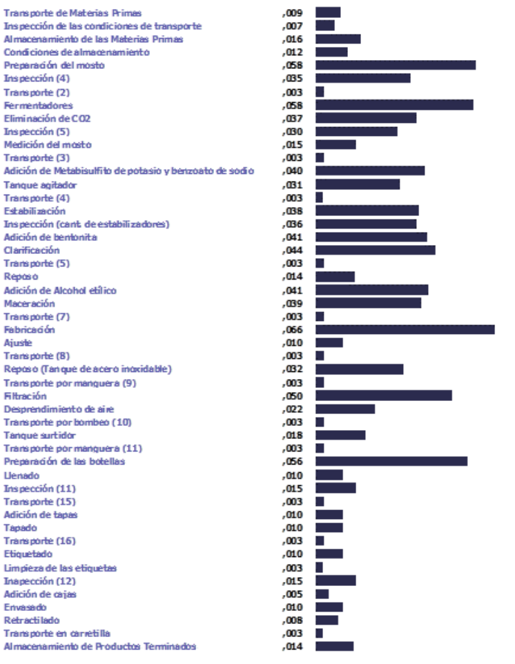 En el caso de la elaboración de vino, se observa que todas las actividades son consideradas de gran importancia, pero que los transportes, a pesar de ser imprescindibles, no constituyen operaciones que agregan valor al producto, por lo que se les asignan poca puntuación. Por otra parte, las inspecciones son consideradas como una de las más importantes, debido a la necesidad de aprovechar al máximo las materias primas y lograr encontrar, a tiempo, los errores que pudiesen ser cometidos.