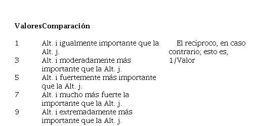2009) y con el empleo del Programa Expert Choice (Versión 11), el cual se utiliza en la aplicación del método Analytic Hierarchy Process (AHP), se graficó la estructura jerárquica para cada una las actividades. Para calcular los pesos se tomó en consideración los juicios de los decisores, a partir de la comparación pareada de las alternativas (actividades a ejecutarse en los diferentes procesos). Los juicios empleados para la comparación fueron los establecidos por Saaty (1994; 2008), mediante los cuales, entre dos alternativas cualesquiera, se establece la siguiente comparación (Tabla 1):