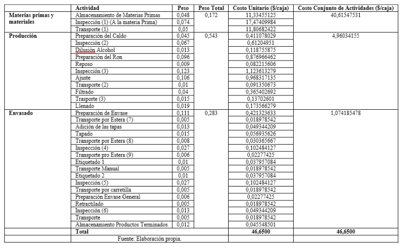 Tabla 2:Costos y pesos de las diferentes actividades en la elaboración del Ron Refino 32 Grados Alabao 700 ml.