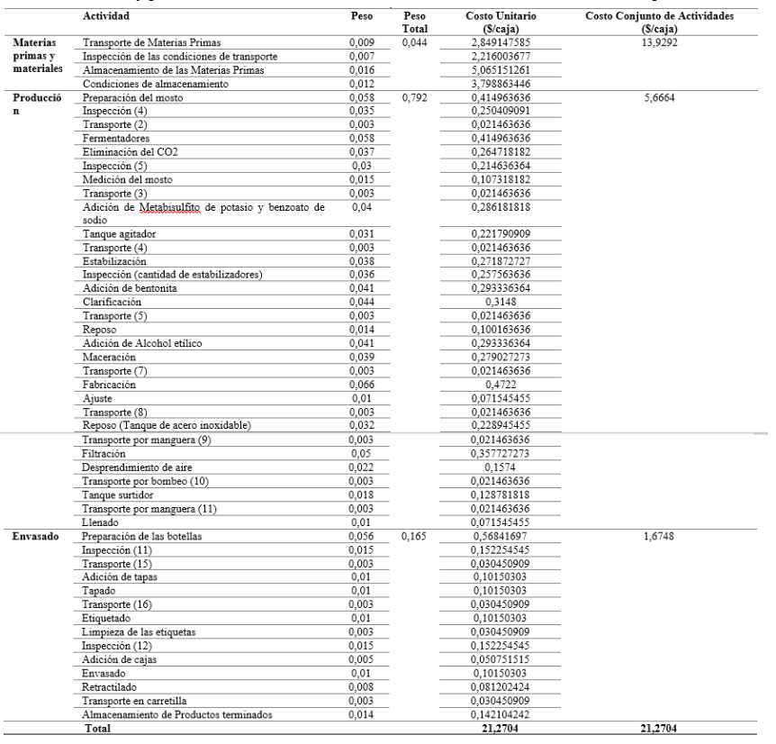 A partir de los valores de las fichas de costo de los productos en la producción de vino se ponderaron los costos por actividad en función de los niveles de importancia de las actividades en la producción de vino, específicamente el Vino Dulce de Pasas de 750 ml. (Tabla 3).