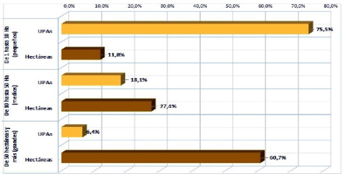 Como se puede observar, el 75,5% de la superficie agrícola está compuesta por unidades productivas que promedian 11,8 % hectáreas. Si se le compara con el resto, se podrá concluir que existe una polarización en la concentración de la tierra. Esta situación explica el papel y lugar de la pequeña propiedad en el capitalismo subdesarrollado. Sin embargo, ello choca con los intereses de algunos promotores de la modernización agrícola, para quien esta estructura es un freno para el desarrollo del capitalismo, en especial por la baja productividad de las actividades agrícolas parcelarias (Ocaru, 2015).
