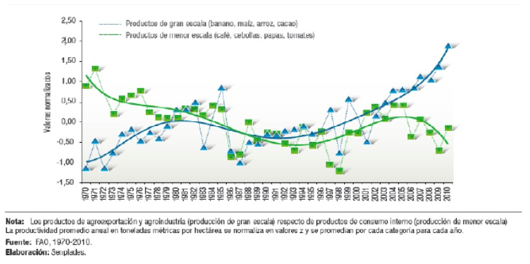 Tal situación es expuesta a través de estudios realizados por la FAO y citados por la Secretaria Nacional de Planificación del Desarrollo (SENPLADES). El gráfico siguiente ilustra las diferencias de productividad de los exportadores con respecto a los productores para el mercado interno, verificándose una productividad mayor de los primeros. Para el caso ecuatoriano, estos últimos son una variable esencial en la soberanía y seguridad alimentaria del país y se le reconoce un rol determinante en este aspecto (MAGAP, 2016).