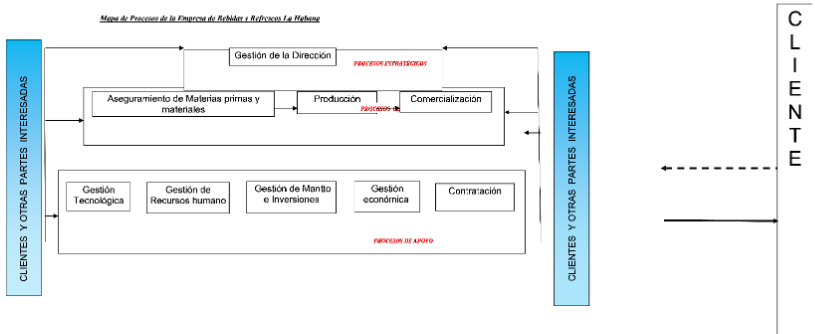 La investigación se realiza en la Empresa de Bebidas y Refresco de “La Habana” en el año 2017 con el objetivo de valorar el diagnóstico estratégico de la empresa utilizando herramientas del Modelo DEISDE como son: las matrices de relaciones externas e internas y la evaluación del nivel de integración del sistema de dirección de la empresa. Para la confección de las matrices de relaciones externas e internas a través de los procesos claves de la Empresa se hace necesario conocer el Mapa de procesos de la Entidad, el que se muestra en la Figura 1.