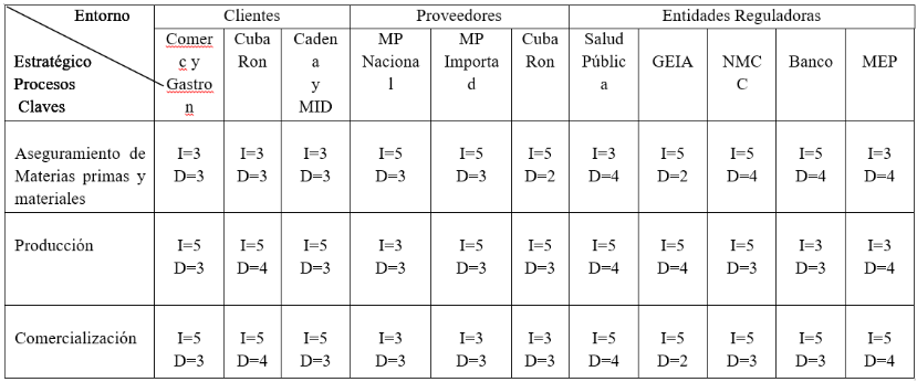 Las relaciones externas son las que se establecen entre los procesos claves y el entorno estratégico de la Entidad, que en este caso son los clientes que consumen los productos que se elaboran en la Empresa, los proveedores de las materias primas y materiales tanto importados como los adquiridos en el país y las entidades reguladoras (Tabla 1).