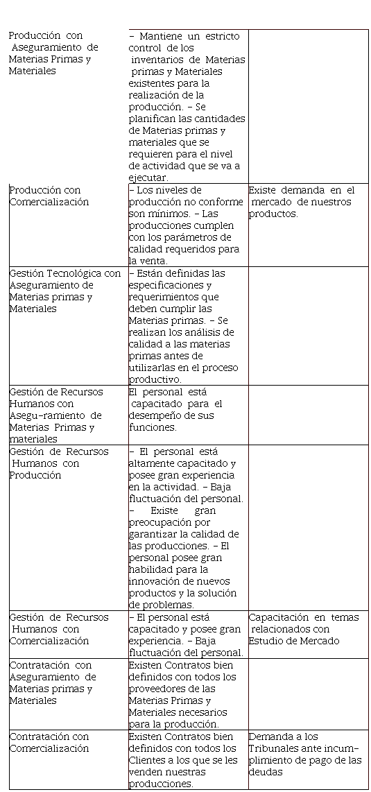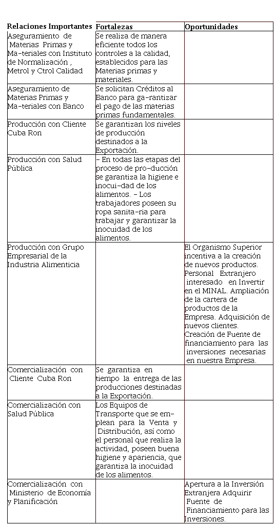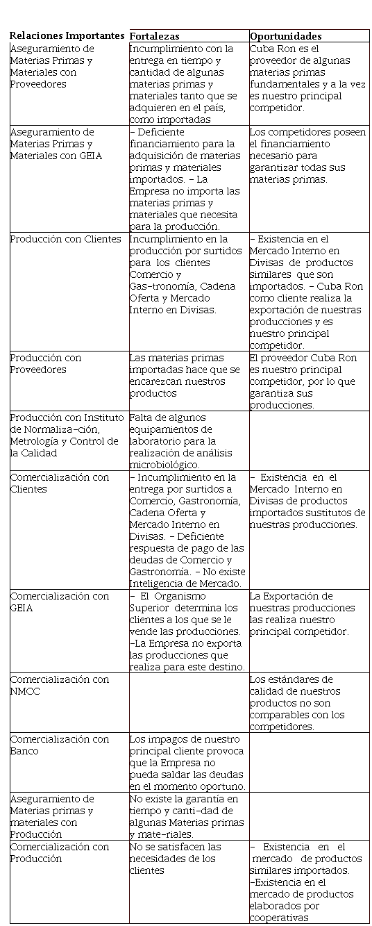 Para identificar las fortalezas y oportunidades que inciden en el cumplimiento de la misión de la Empresa se tomaron de todas las relaciones tanto las internas como las externas aquellas que son importantes y al mismo tiempo tienen buen desempeño, se caracterizaron dando los resultados que aparecen en la Tabla 3.