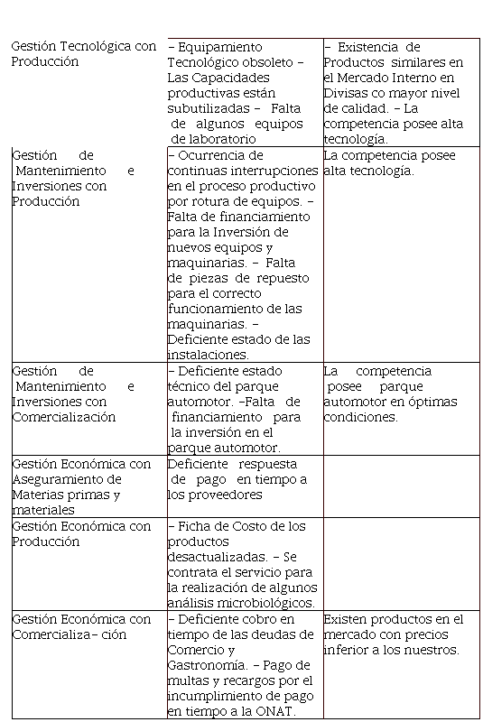 Las debilidades y amenazas que afectan el cumplimiento de los objetivos fueron identificadas de las relaciones que son importantes y no tienen buen desempeño, a las que se les llaman relaciones críticas, al caracterizarlas dio los resultados que se muestran en la Tabla 4.