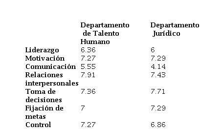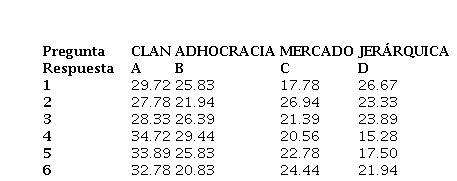 En el gráfico 1 se representó el Test de Cameron y Quinn, cuyos resultados reflejaron que la cultura del clan o de la función es la que predomina en los dos departamentos (Talento Humano y Jurídico) por su orden, equidad, cohesión, etc.