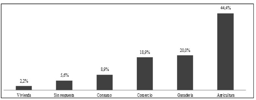 Los socios encuestados al solicitar un crédito, el destino preferencial es la agricultura, invertir en el campo, para que sus cosechas den frutos y poder sustentar a sus familias de escasos recursos económicos. La siguiente alternativa con alta incidencia es la ganadería con un 20,0%, seguida del comercio con un 18,9%, lo que se destaca es que los socios realizan inversiones en sus tierras para trabajar dignamente con el sudor de su frente.
