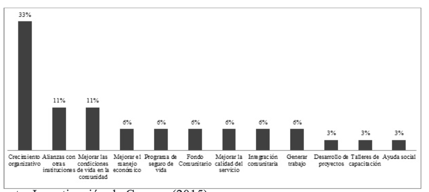 Las proyecciones planteadas por los socios encuestados en la figura 9 presentan un 33% al crecimiento de la organización, seguido de alianzas con otras instituciones y la búsqueda del mejoramiento de las condiciones de vida de la comunidad ubicándose en el 11%, lo que en reuniones asistidas son temas de orden primordial.